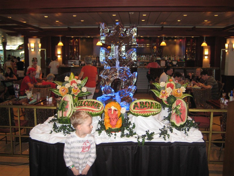 Alex framför staty av is på ett bord
