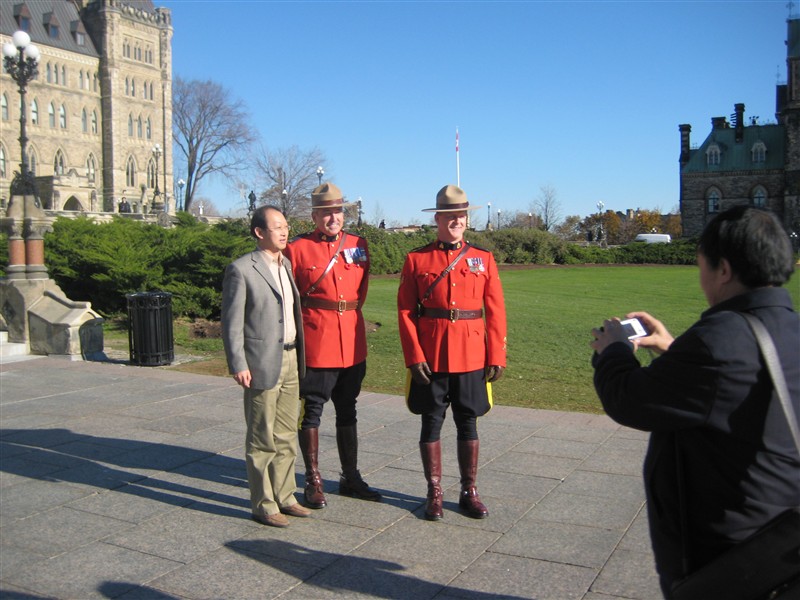 Two Royal Canadian Mounted Polices with a tourist outside the Parliament Building in Ottawa