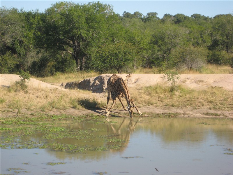 Giraffe drinking water at a pond