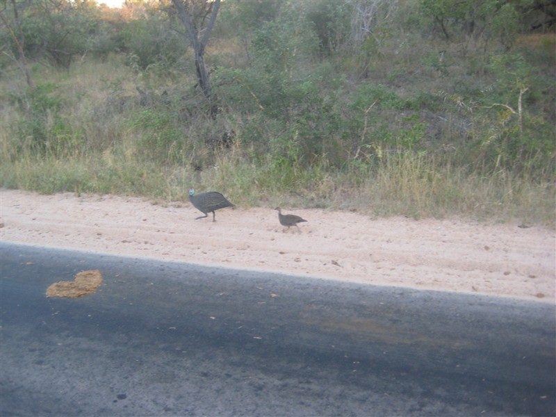 Guinea Fowl with chick beside the road
