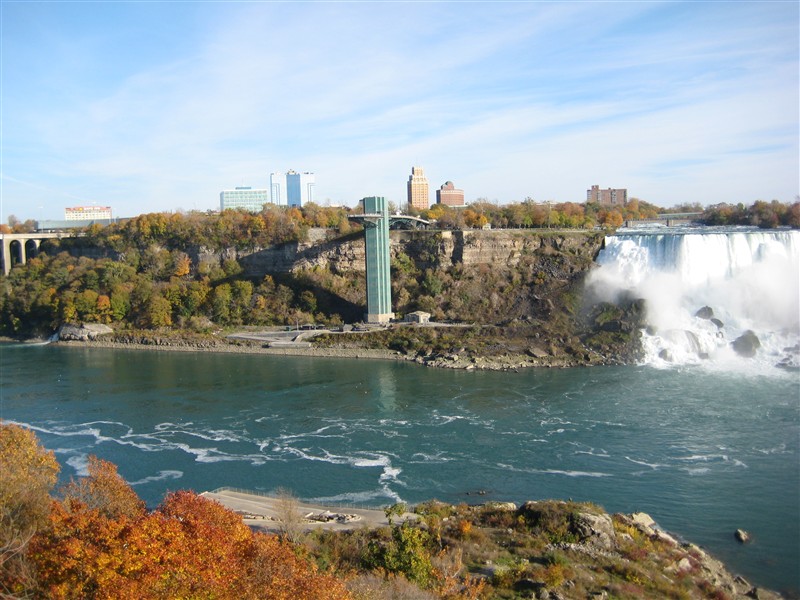 Vy mot vattenmassor som faller ner 54 meter i Niagara floden