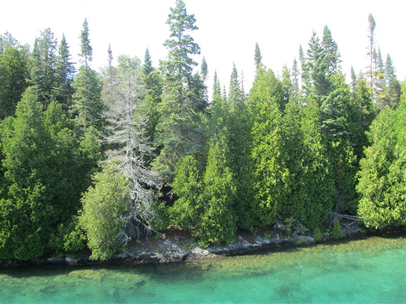 Dichter Wald mit Zederbåumen bei dem See Huron