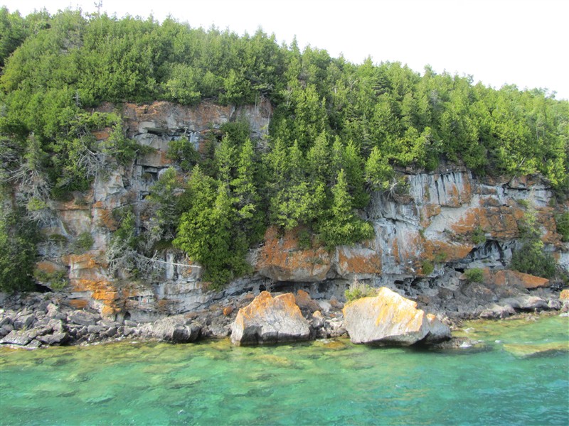 Forest overgrown barren rocks beside crystal-clear water