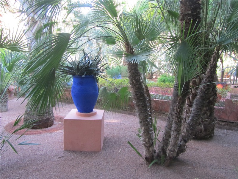 Blue pot among palm trees in Jardin Majorelle