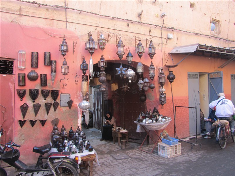Smal gång i en souk där det säljs marockanska lyktor i Medinan