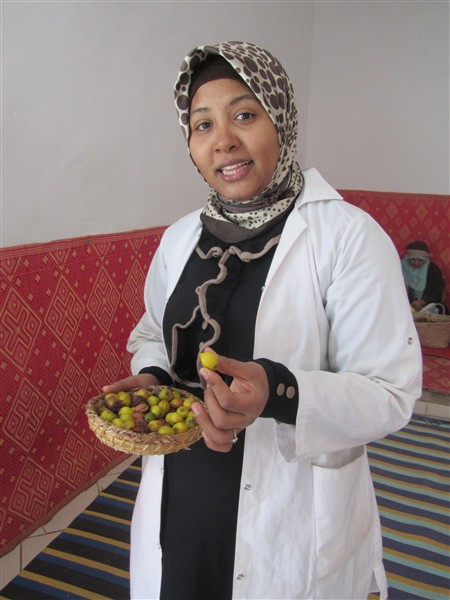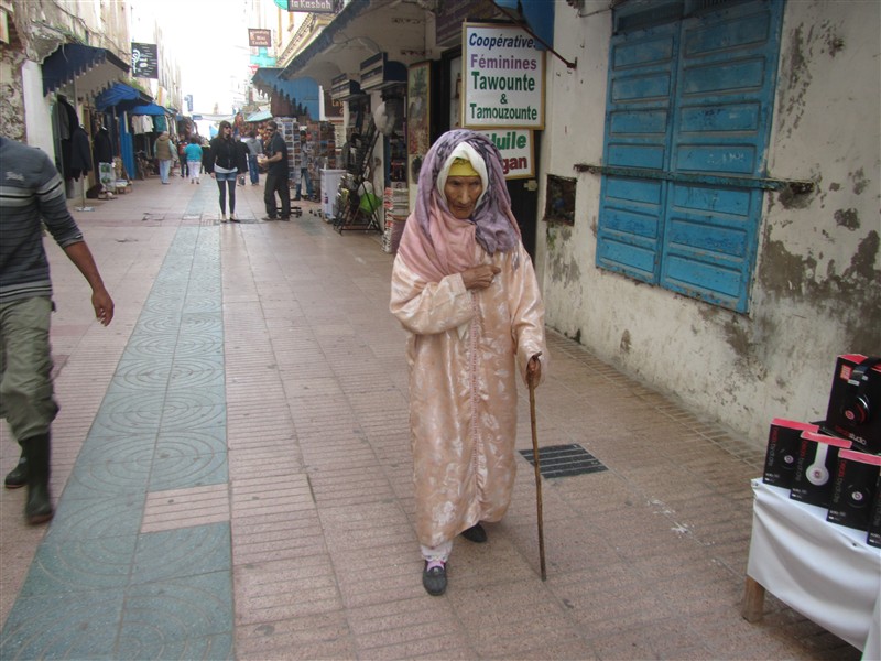 Äldre marockansk kvinna med djellaba i en souk i Medinan