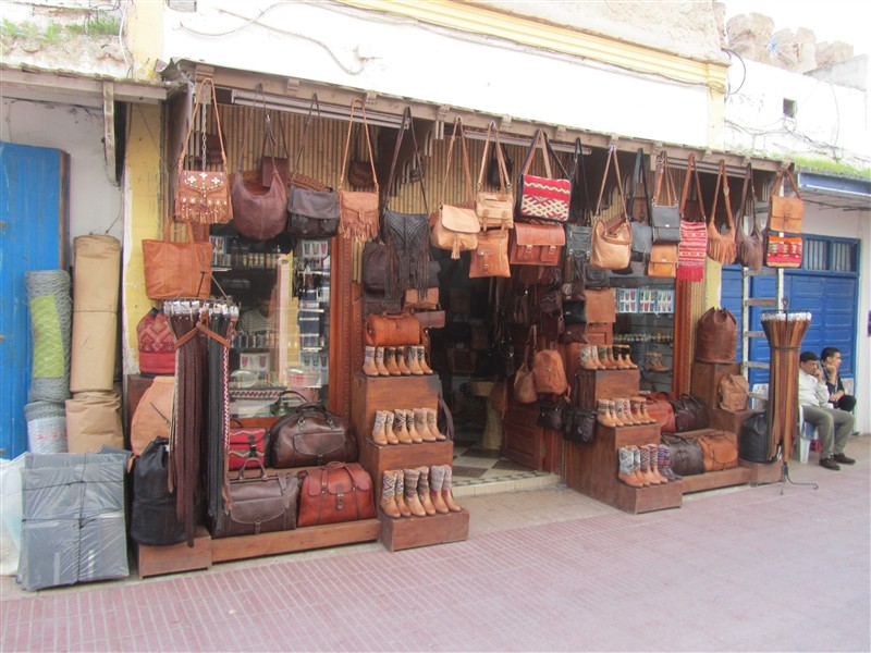 Sale of Moroccan bags and boots of leather in the Medina