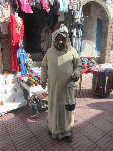 Older Moroccan an with djellaba and incense in a souk in the Medina