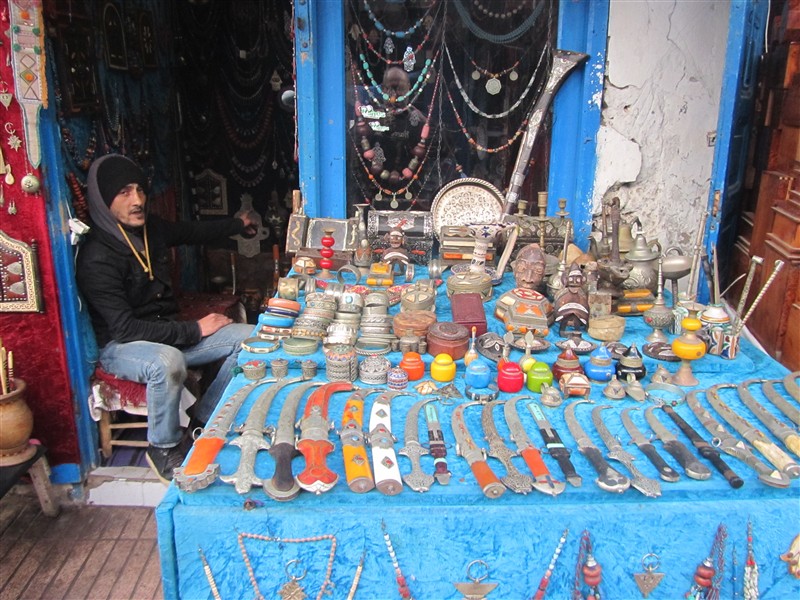 Hippie selling daggers and jewellery in a souk in the Medina