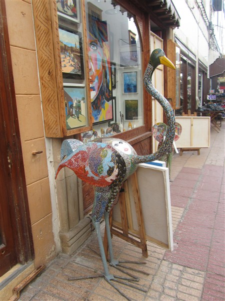 Colorful crane outside a shop in a souk in the Medina