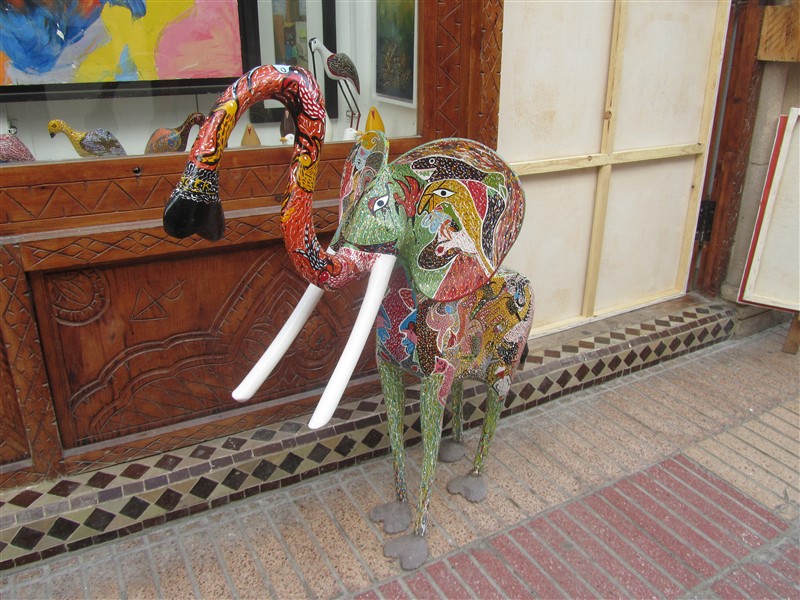 Colorful elephant outside a shop in a souk in the Medina