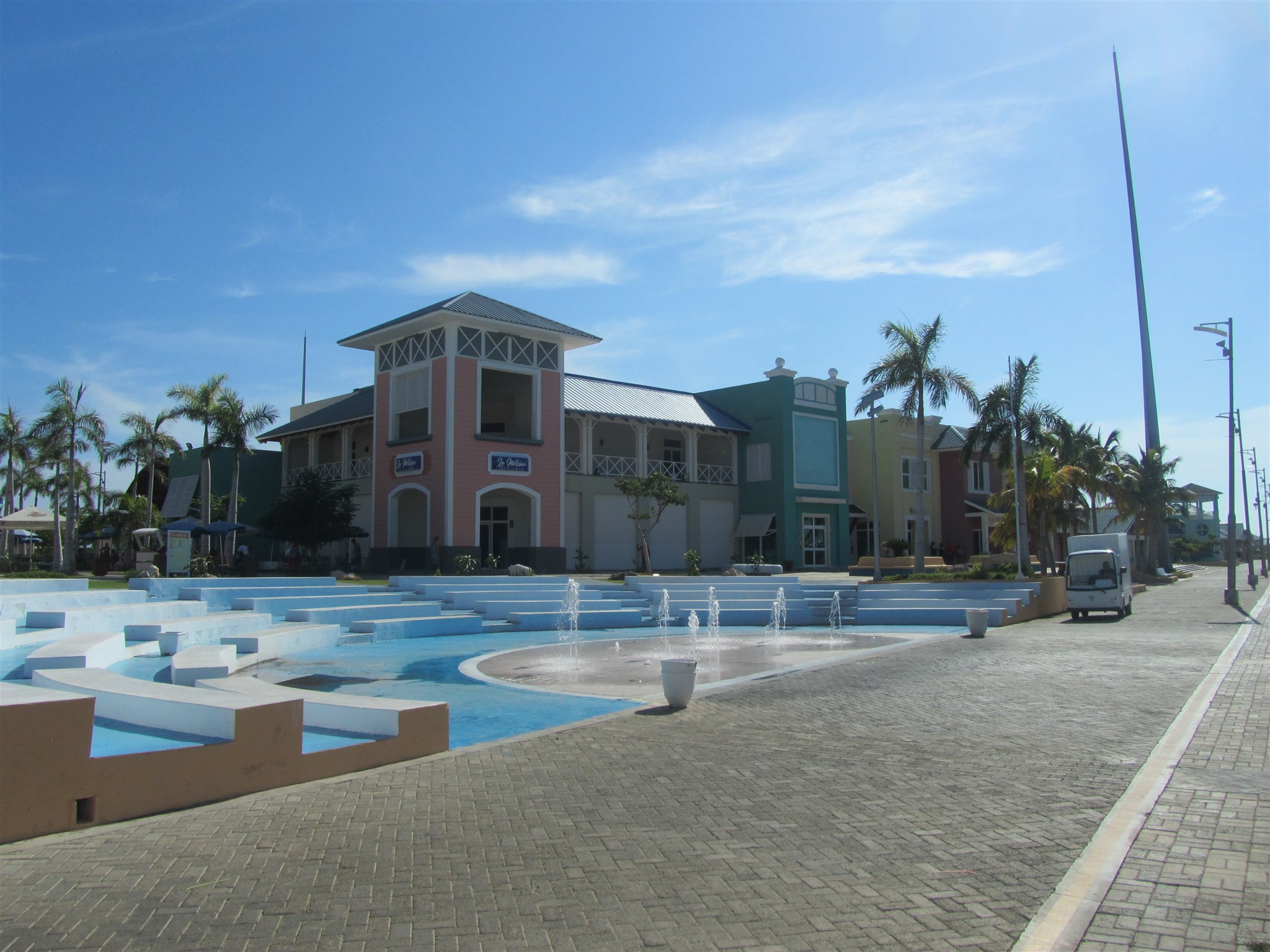 Springbrunnen vor modernen Modegeschäften bei "Plaza Las Morlas" auf der Hotelanlage wo ich wohne