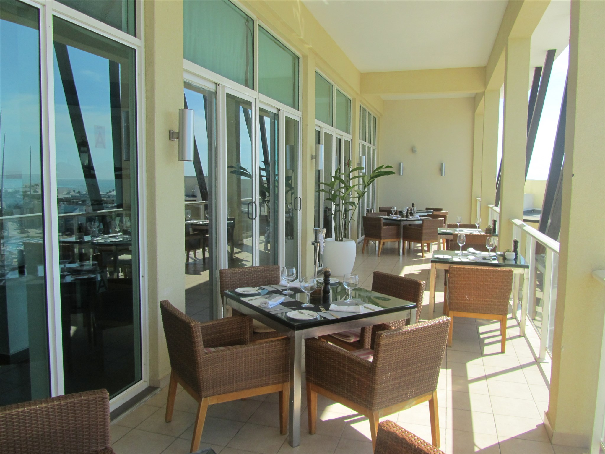 Balcony with tables at the restaurant "La Vigía" on the highest floor of the hotel I stay at