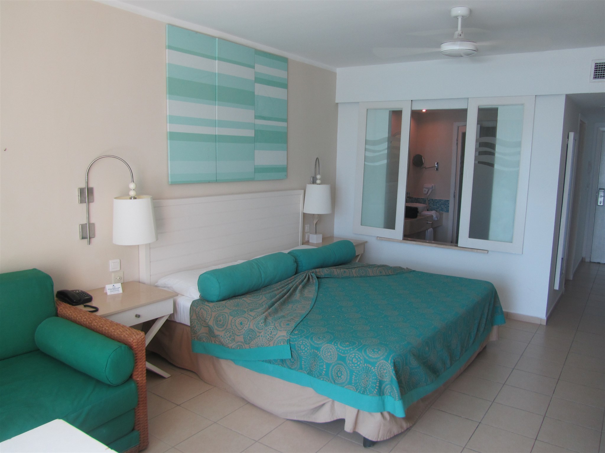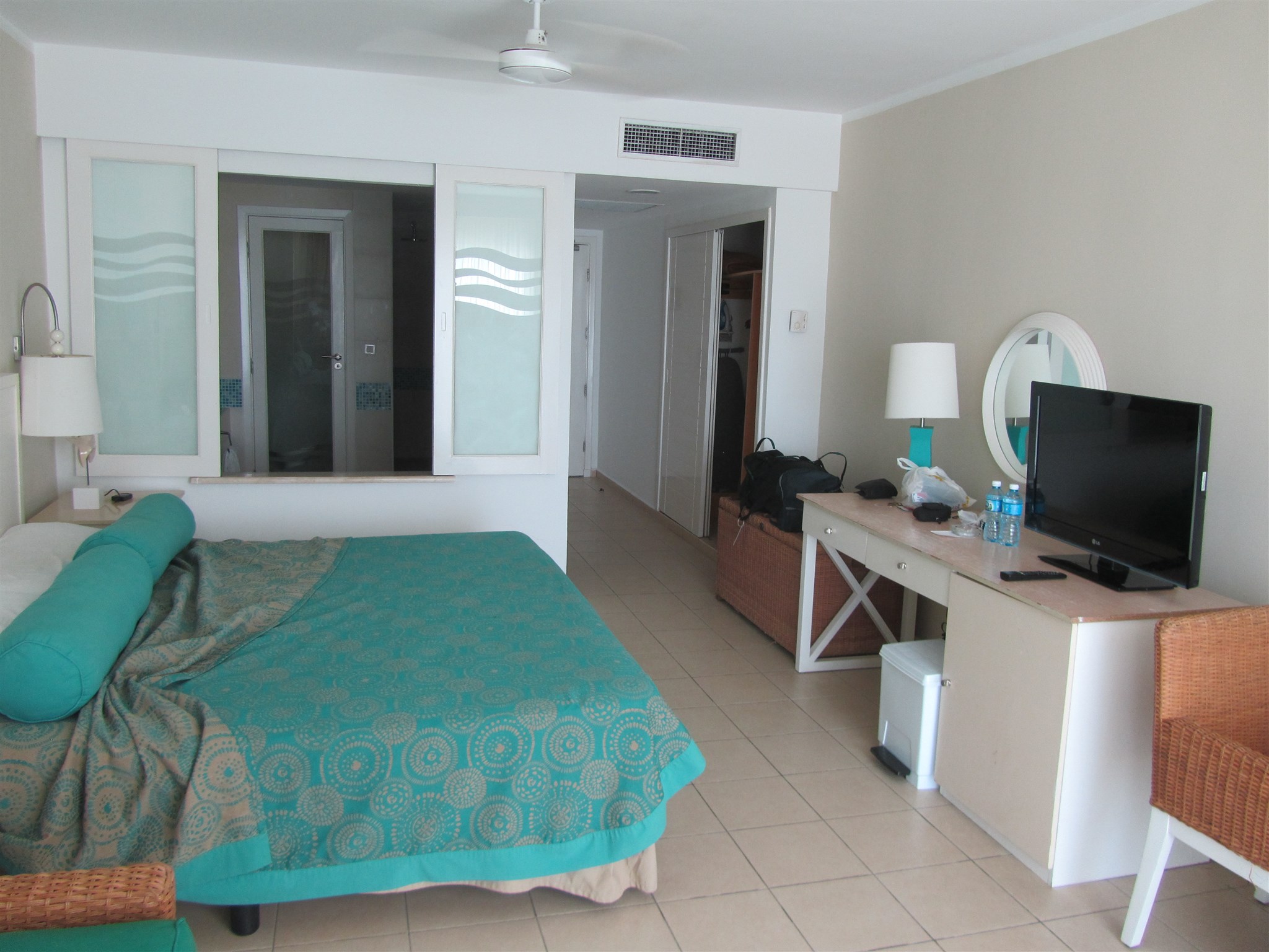 My bedroom at the hotel with sliding windows to the bathroom which has both bathtub and shower