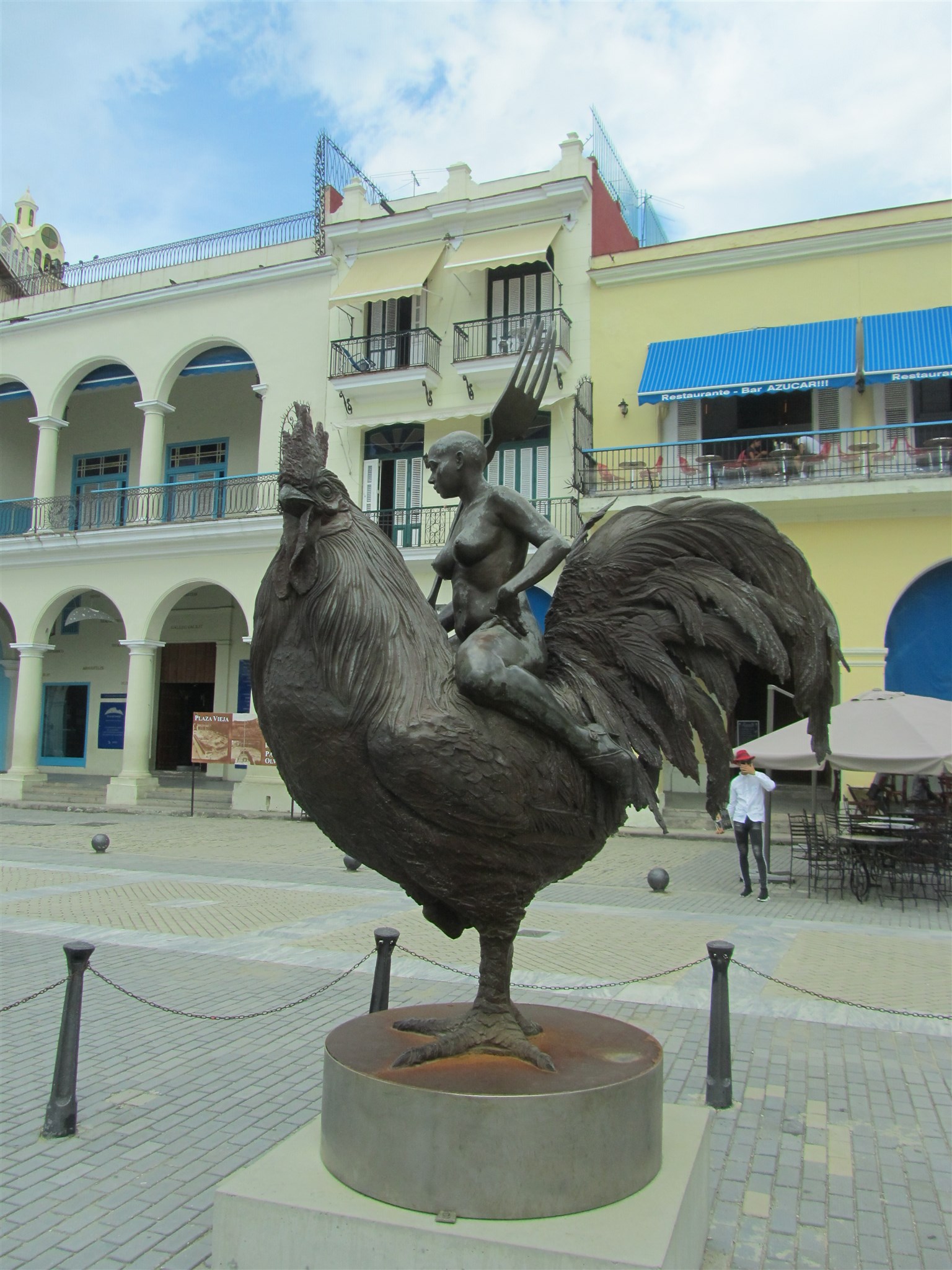Woman with a fork who rides on a rooster on "Plaza Vieja" in the Old Town of Havana