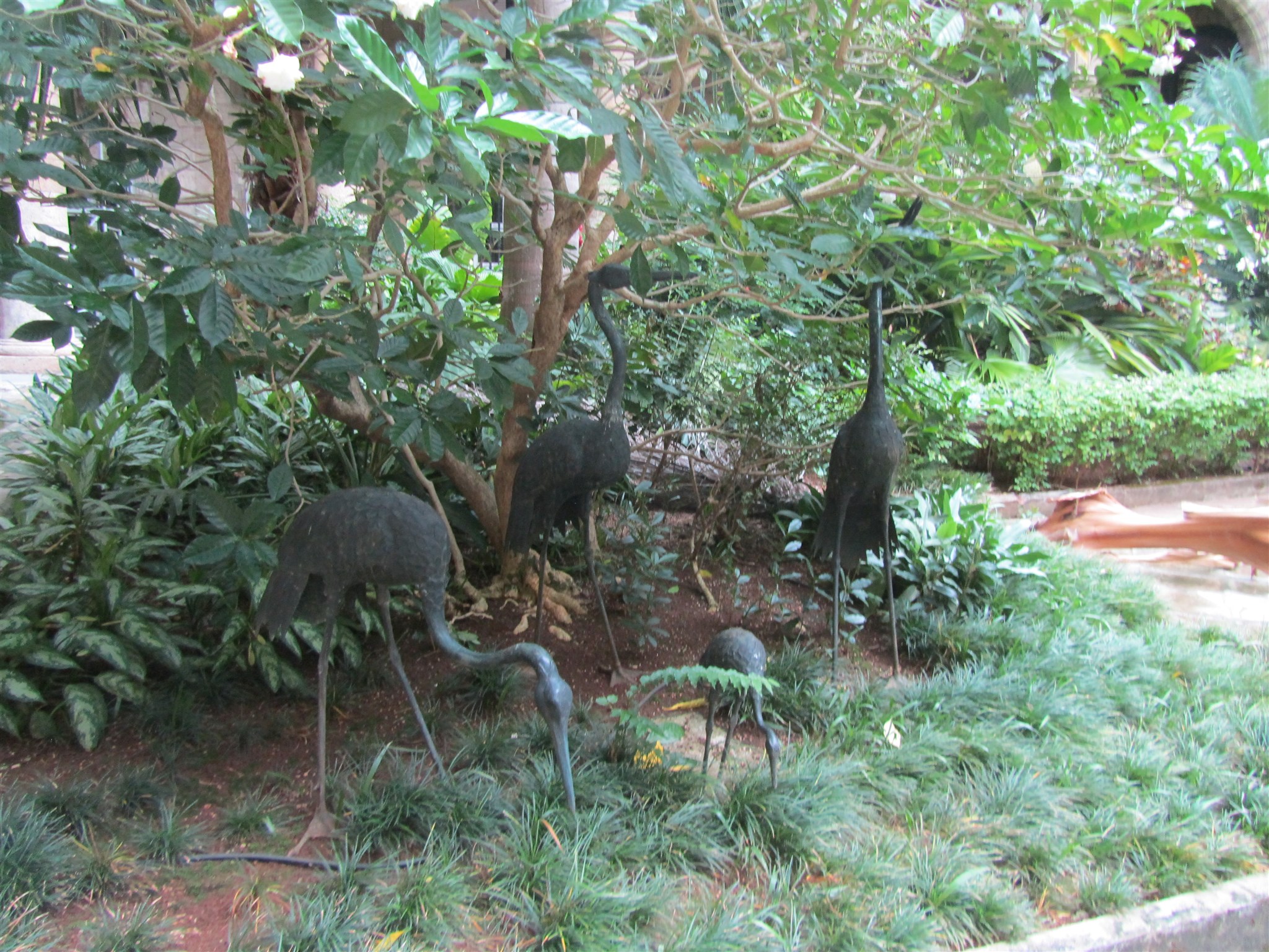 Statuen von Kranichen in dem Garten auf dem Innenhof von "Palacio de los Capitanes Generales"