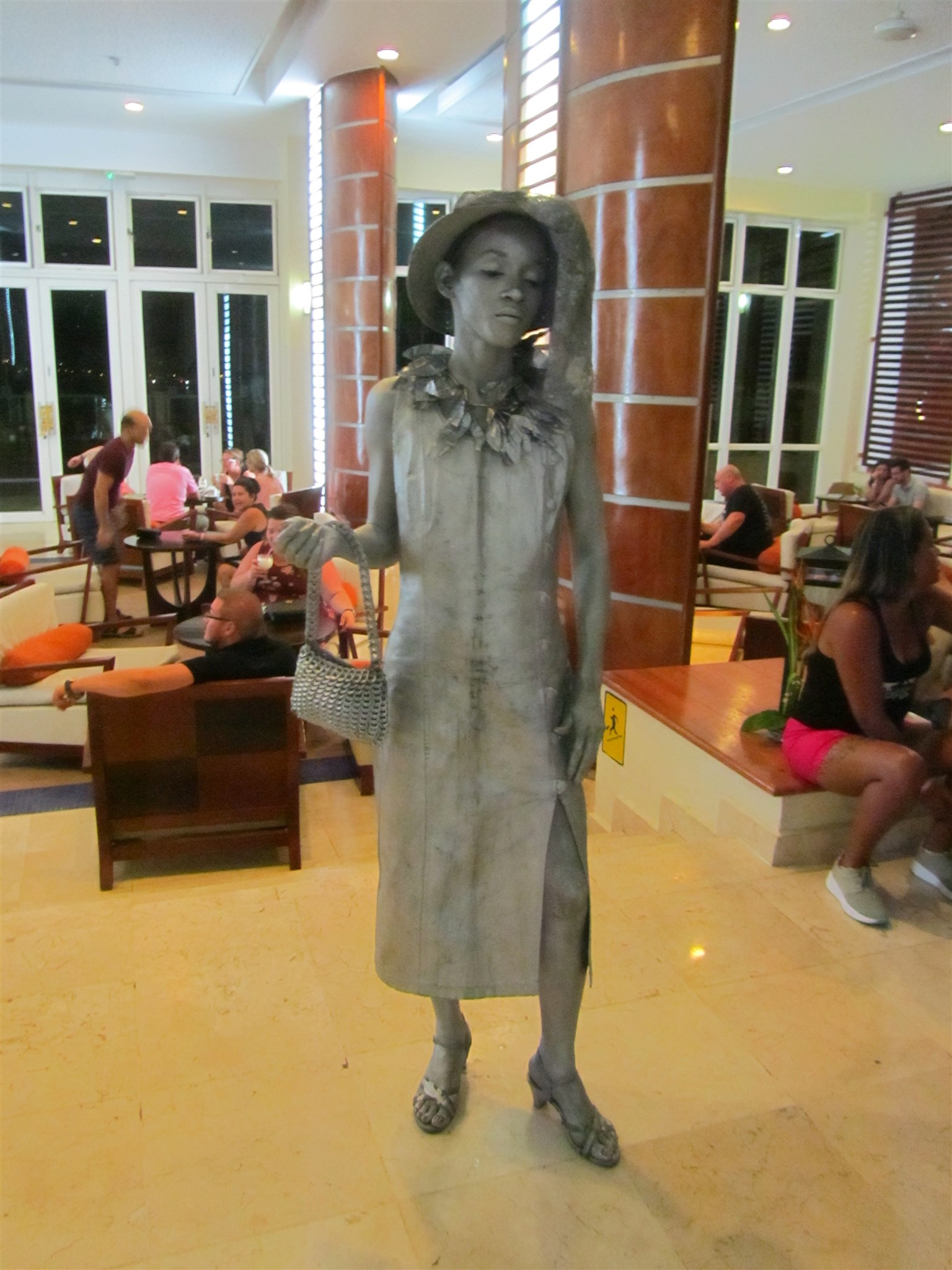 Aktris med klänning och hatt i foajén på "Melia Marina Varadero Hotel" när jag kom tillbaka från utflykten till Havanna