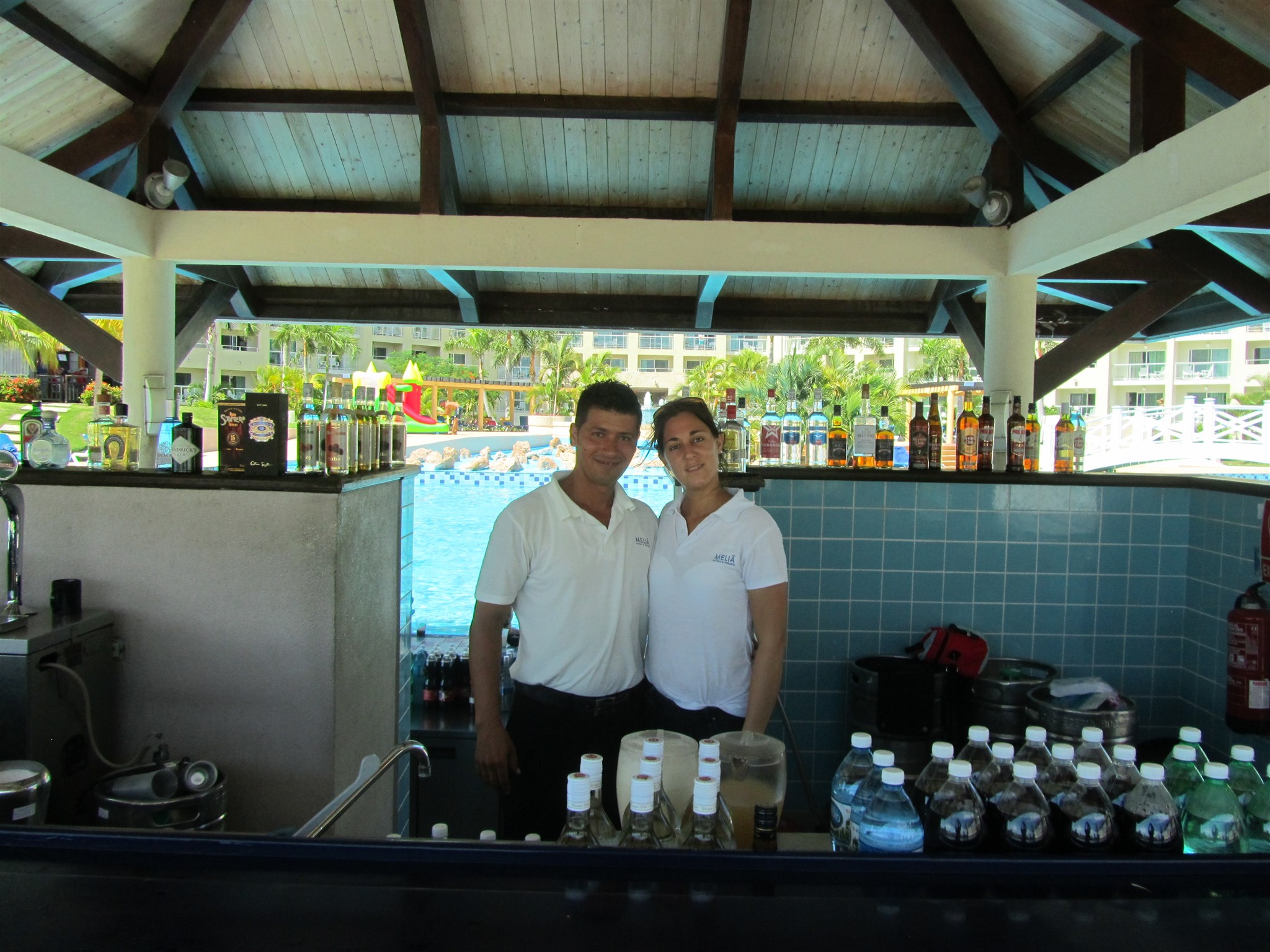 Two bartenders at the bar of the swimming-pool area at the hotel facility