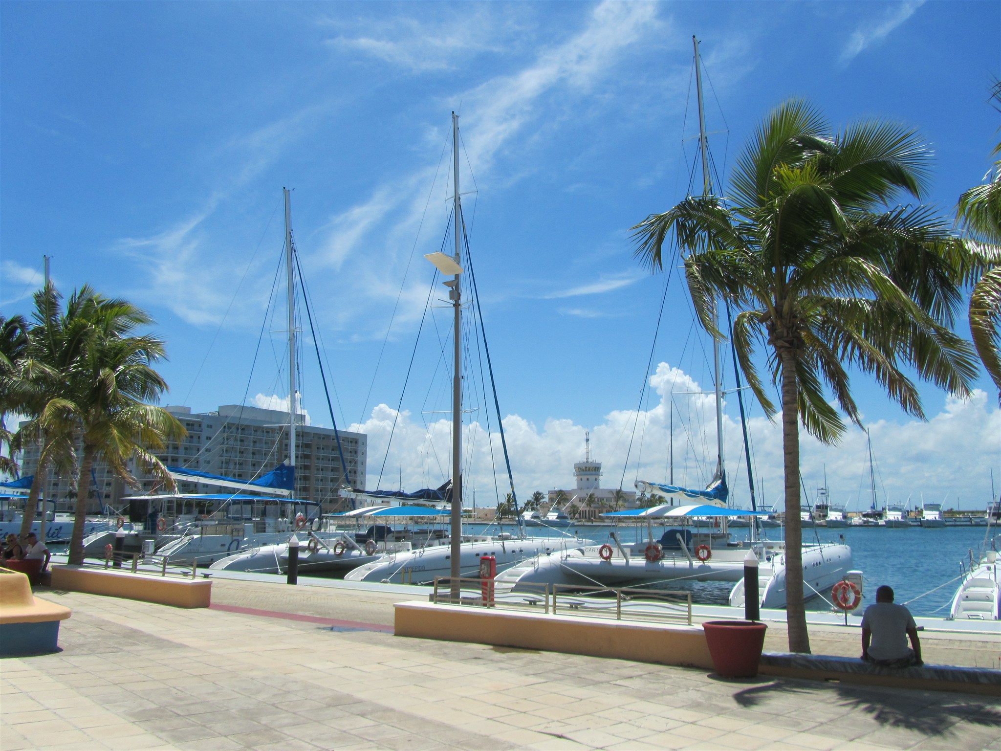 Grosse Segelkatamarane an dem Kai von der Hotelanlage wo ich wohne