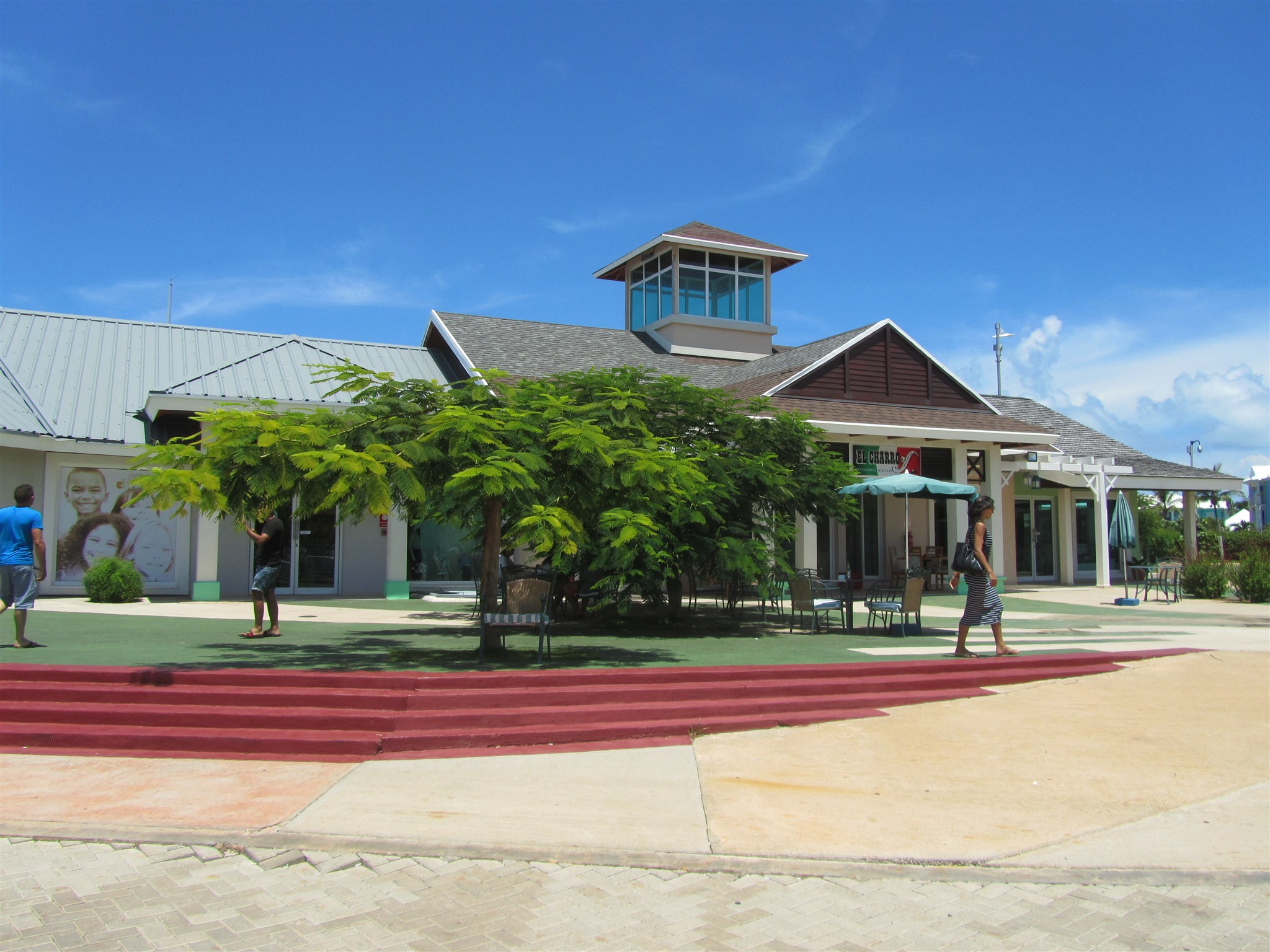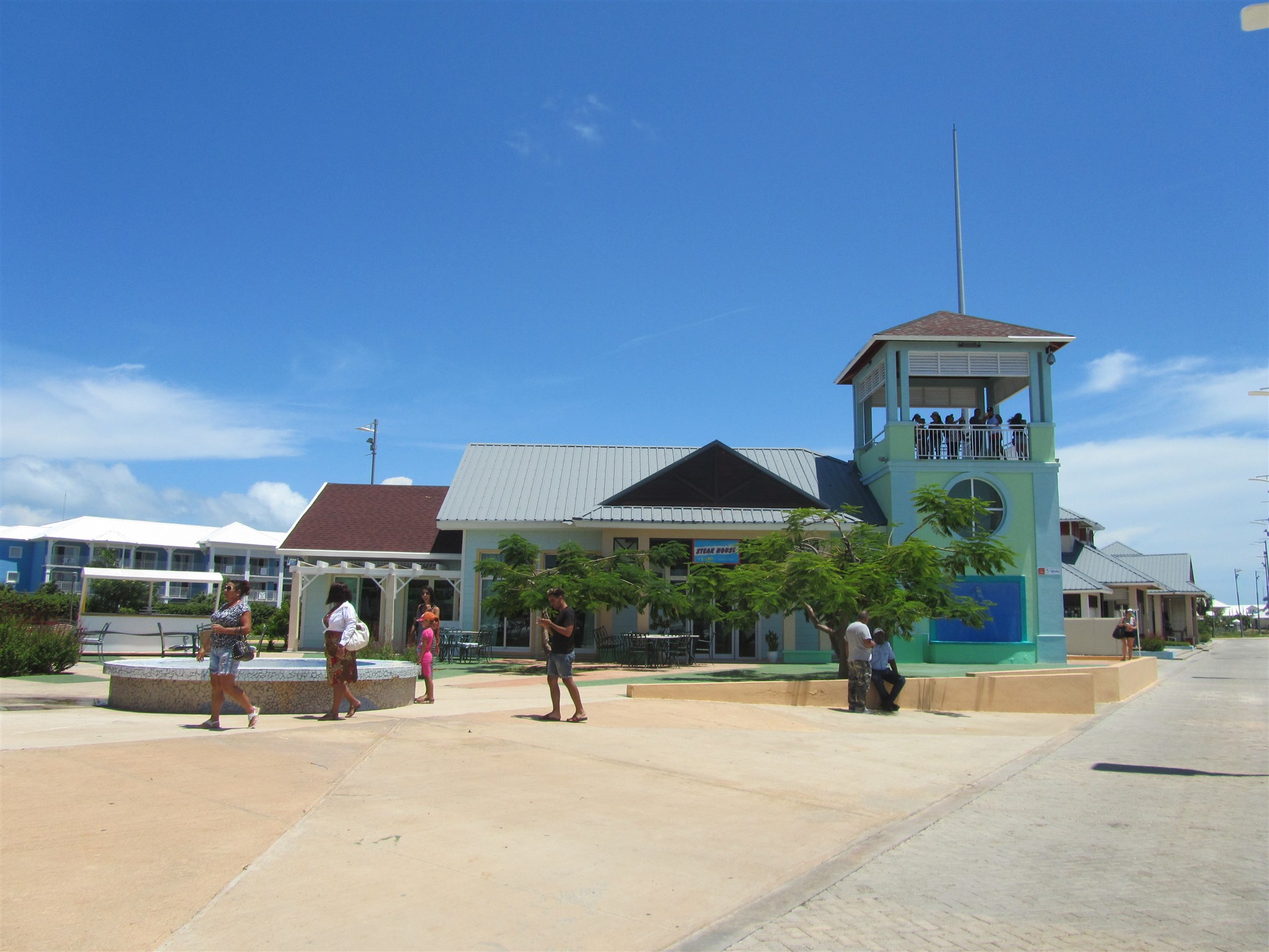 Springbrunn framför moderna affärer vid "Plaza Las Morlas" på hotellanläggningen jag bor på